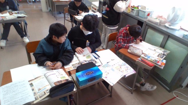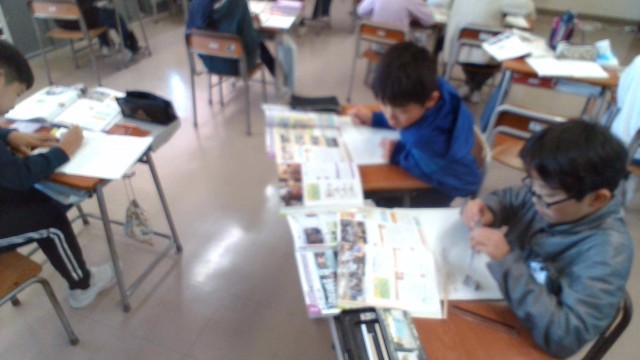 社会科では、情報産業について自由進度で学習を進めています。テレビ局ではどのように番組をつくっているのか、教科書や資料集を使って自分で調べています。