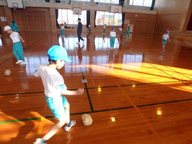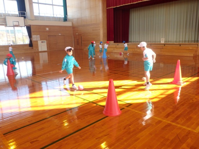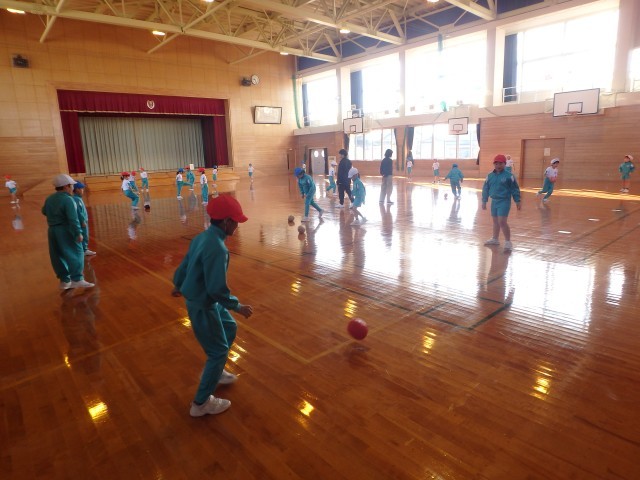 体育の時間に、自分で作ったマイボールを使って運動をしています。今は、狙った場所に正確にボールを蹴ったり、蹴る強さに気を付けながらドリブルをしてボールを運んだりする練習をしています。ボールの操作に慣れた後は、ゲームをしていく予定です。