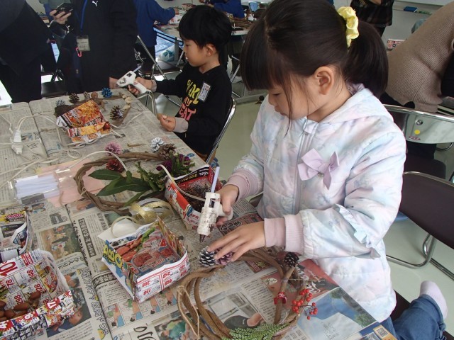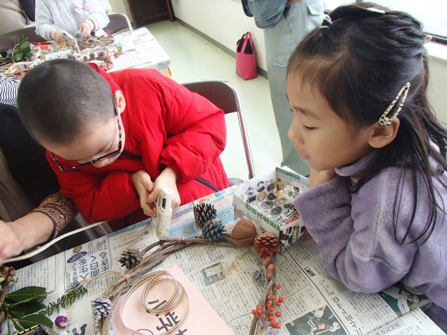 今年の世代間交流活動では、たくさんの自然の素材を使った「リースづくり」を体験させていただきました。同じテーブルに座った地域の方とお話したり手伝ってもらったりしながら、楽しく活動しました。素敵なリースが出来上がり、子供たちはとても嬉しそうでした。