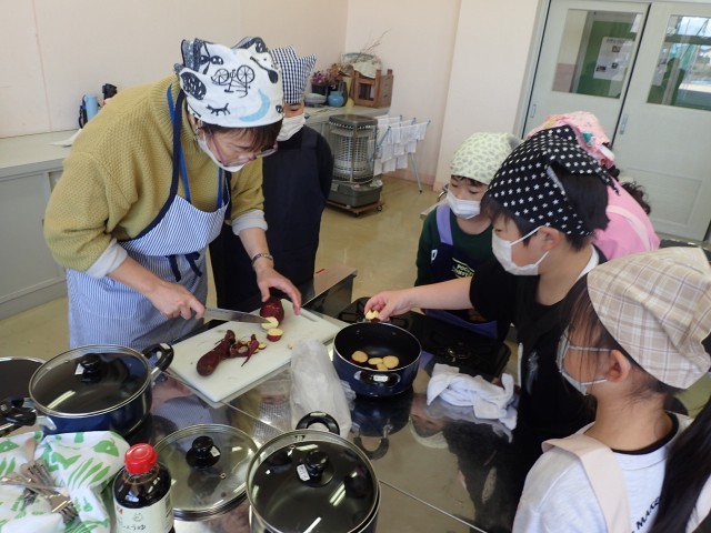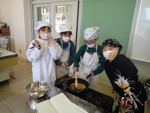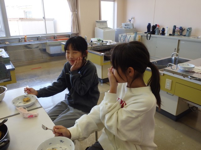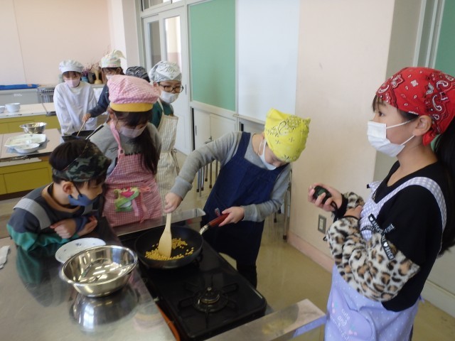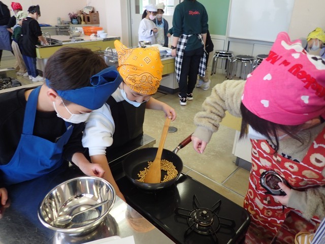2・3年生合同で、さつまいもきなこをつくりました。さつまいもは2年生が育てたもの、きなこになる大豆は3年生が育てたものです。2年生は冷たい水で一生懸命さつまいもを洗い、しょうゆや塩で茹でました。3年生は大豆を炒って、機械を使って細かくし、砂糖等を入れてきなこをつくりました。この二つが組み合わさると、今まで育てた苦労も合わさってよりおいしく感じられたようで、食べた瞬間歓喜の声が上がるほどでした。それぞれが育てたものを味わうだけでなく、違う学年の人のために調理してあげたいという気持ちも合わさって、とてもよい学習の時間となりました。