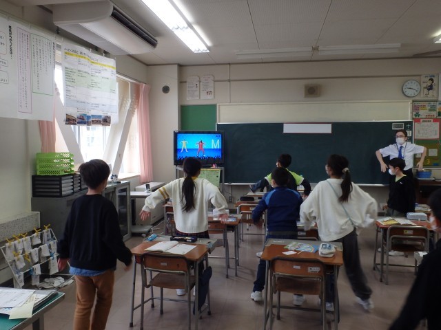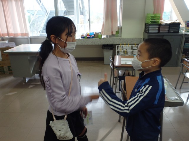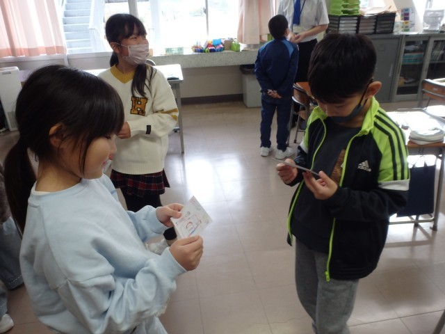 3年生では、外国語活動でアルファベットの大文字を学習しました。授業の初めは「ABCダンス」です。みんなノリノリで踊り、体を使ってアルファベットを覚えました。学習の最後には、自分で作ったオリジナルの名刺を友達と交換する練習をしました。「Hello! Nice to meet you! I'm ~~.」と言って渡しました。次回からは「This is for you」の学習に入ります。いろいろなグリーティングカードについて学習する予定です。
