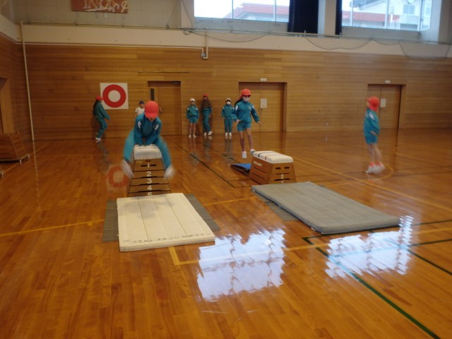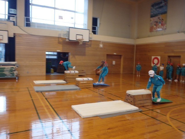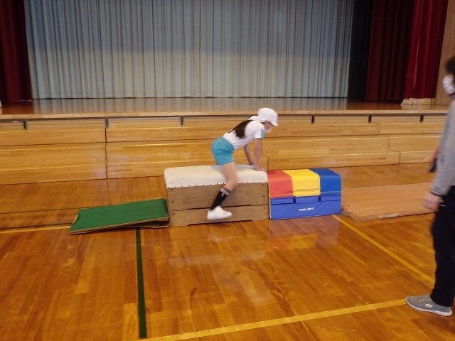 今日はいよいよ開脚跳びにチャレンジです。スモールステップで、とびのり・とびおりをしたり、またぎこしをしたりしました。子供たちはみんなすぐに合格し、次は開脚跳びの3段、4段、5段と進めていきました。進んでいった子供たちは、マットに付けた印より着地が遠くになるように頑張って何度も練習しました。
