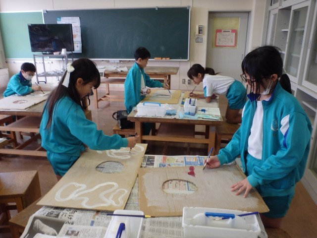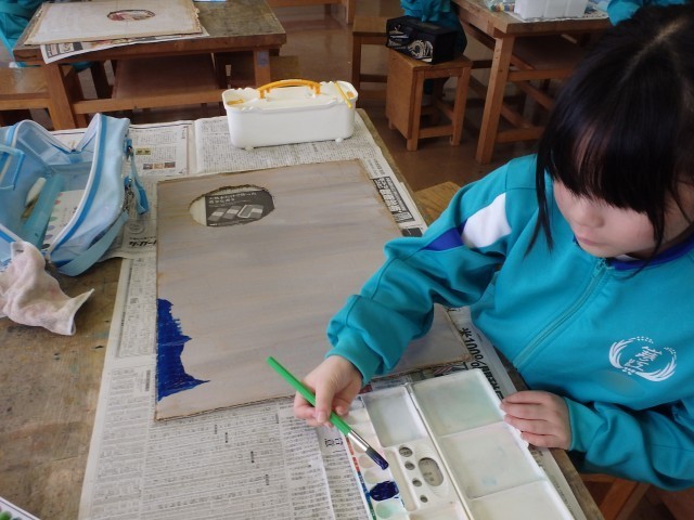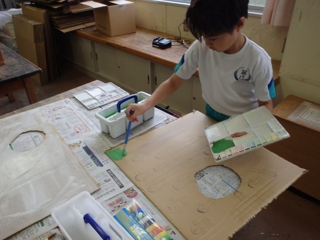 図工では「顔を出したらなんだかワクワク」の学習で、顔をはめるパネルを作っています。子供たちの発想はとても豊かで、サッカー選手でゴールを決める瞬間や、おばけ、ねこ、誕生日おめでとうなど、さまざまなものを作っています。楽しい作品ができるよう、子供たちも励んでいます。