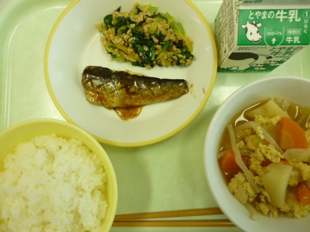 今日の給食は、いわしの土佐煮、納豆和え、卵とじ、ご飯、牛乳です。