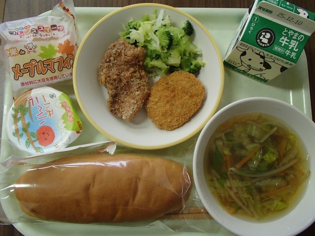 主菜は豚肉の香り揚げ、または、えびカツ、デザートはリンゴゼリー、または、メープルマフィンのどちらかを選びます。その他、春雨スープ、添え野菜、コッペパン、牛乳でした。