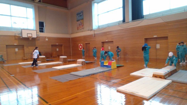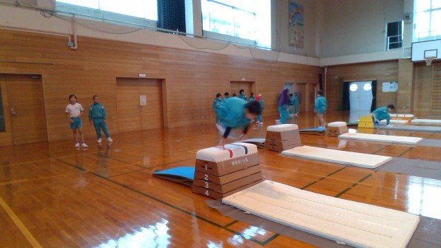3・4年生の跳び箱では、「かかえ込み跳び」に挑戦しました。まずはうさぎ跳びで跳び箱を越える練習から。だんだん慣れてきたら、真ん中が繰りぬかれた跳び箱へ。(写真のカラフルな跳び箱です)そしてだんだん本物の跳び箱へと移行していきました。ちょっと怖い気持ちをもちつつ、みんながんばりました。