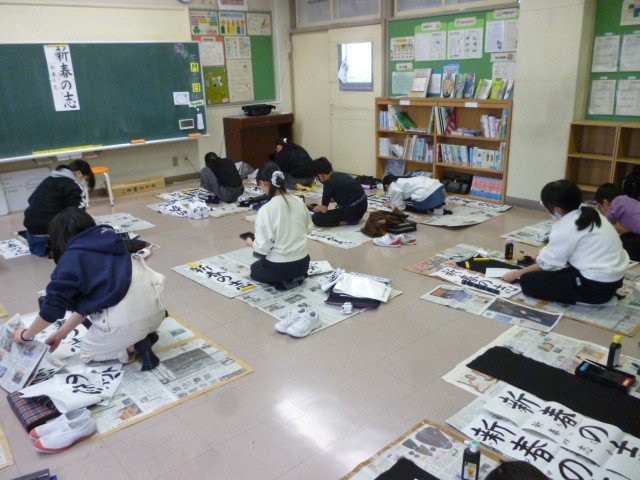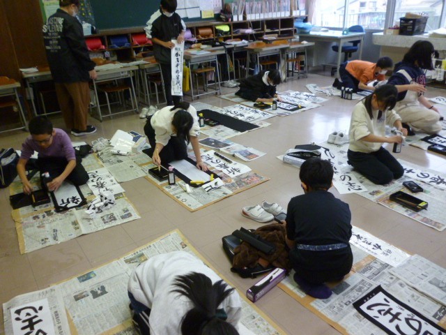 今年度は「新春の志」を書きます。子供たちは、とても落ち着いた雰囲気の中で丁寧に筆を進めていました。