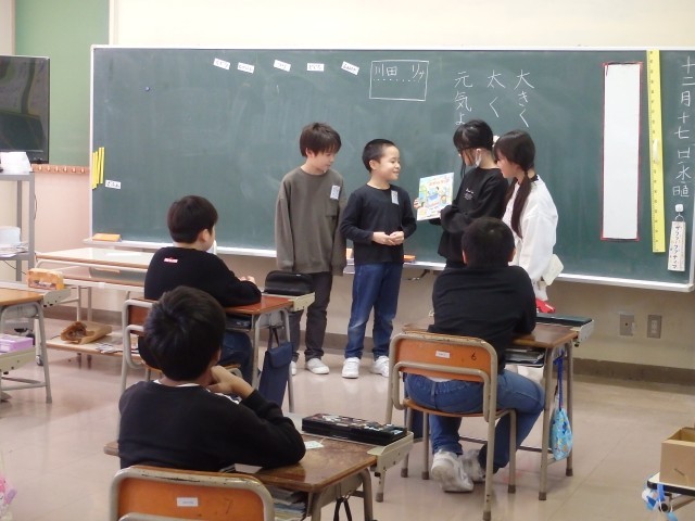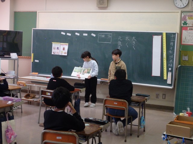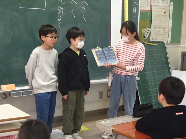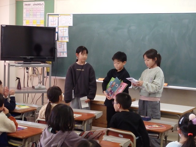 学習参観で決めた「1・2年生へのおすすめの本」を今日、ついに紹介しました。各班、全員そろっての練習も難しい中、合間を縫って練習した子供たち。短い時間での発表になりましたが、どの班も上手にブックトークや読み聞かせができたと思います。中身は1冊しか紹介できませんでしたが、全員の選んだ本をプリントに一覧にして伝えました。1・2年生のみなさんが、3年生の一生懸命選んだ本を少しでも「読んでみたい」と思って借りてくれると嬉しいなと思います。