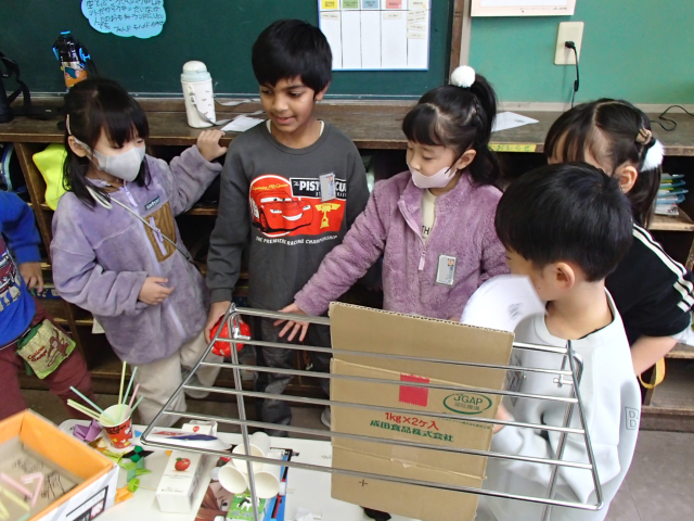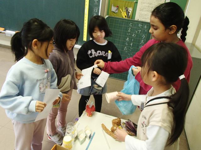 「おもちゃランド」には、2年生さんが生活科の時間に作った楽しいおもちゃがたくさん準備されており、1年生の子供たちは「すごい」「おもしろい」と反応しながら楽しんでいました。