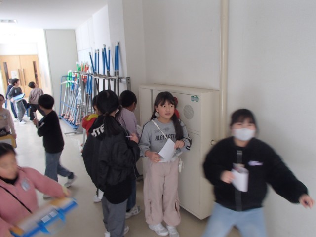 1月26日から始まった給食週間の企画の一つである「給食クイズラリー」が始まりました。クイズの内容は、寒江っこに答えてもらったアンケート結果や調理員さんの仕事や栄養に関することなどです。校内のいろいろな場所に問題が貼ってあり、「第〇問はどこ!?」と声をかけ合いながら探し回る子供たちの姿が見られました。少し難しい問題もありましたが、友達と相談しながら、楽しそうにクイズに取り組んでいました。