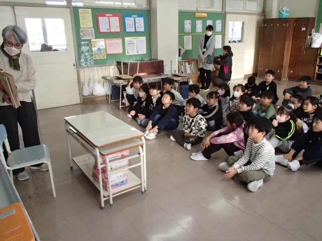 今日は、今年度最後の読み聞かせの日でした。やまんばが出てくる昔話を読んでいただきました。読み聞かせの後には、1年間、楽しい本をたくさん読み聞かせしてくださった地域の方に、みんなでお礼を言いました。