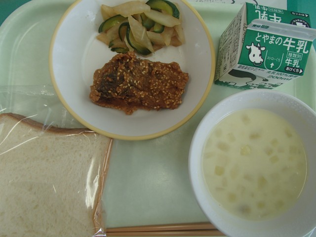 今日の給食は、アジの利休揚げ、大根サラダ、かぼちゃクリームスープ、食パン、牛乳です。