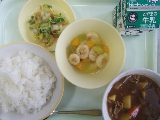 今日の給食は、カレーライス、福神和え、フルーツゼリーミックス、牛乳です。