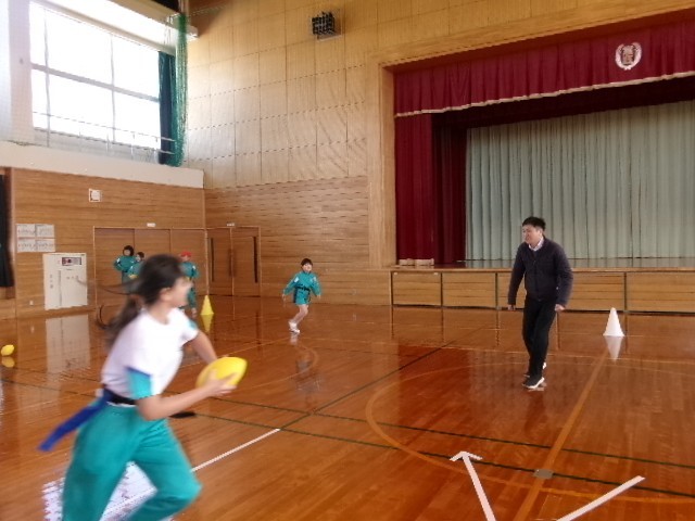 3・4年生は、体育で「タグラグビー」に取り組んでいます。ラグビーとは異なり、ボールを取り合うのではなく、ボールを持っている人の腰に付けた細長いタグを取れば、ボールを取ることができるという競技です。でも、ボールを味方にパスする時は、横か後ろしかできないというのはラグビーのルールと同じです。子供たちは、まず、このルールに慣れるために、今日は先生が敵になって練習をしました。子供たちはこれから、どんどんレベルアップしていくことでしょう。