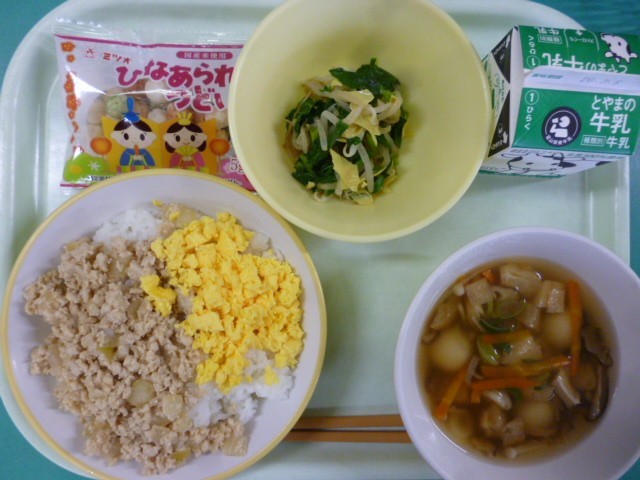 今日の給食は、二色丼(鶏そぼろ・炒り卵)、なばなひたし、白玉汁、ごはん、牛乳、ひなあられです。