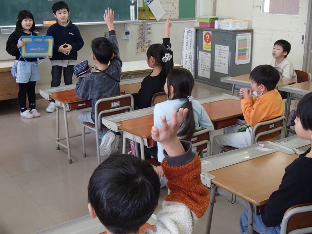 国語の時間に、「これは、なんでしょう」の学習でペアでつくった問題を出し合いました。出題者が出すヒントから答えを一生懸命考え、次々と手を挙げる子供たちの姿がとても素敵でした。大盛り上がりの時間になりました。