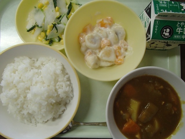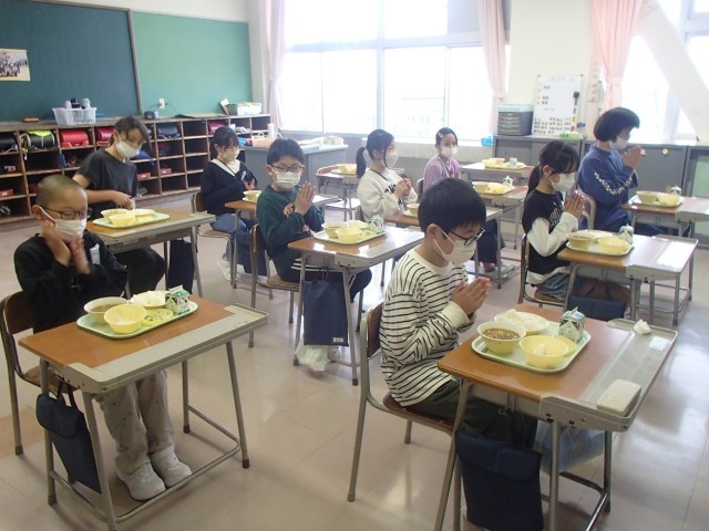 今日から2年生以上の給食が始まりました。献立は、チキンカレー、水菜のサラダ、フルーツヨーグルト、ご飯、牛乳です。今年度も、調理員の皆さんが心を込めて作ります。久しぶりの給食を前に、笑顔いっぱいの子供たちでした。