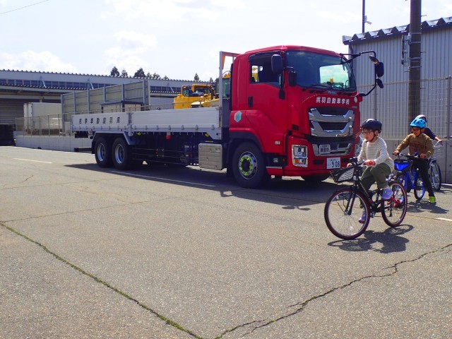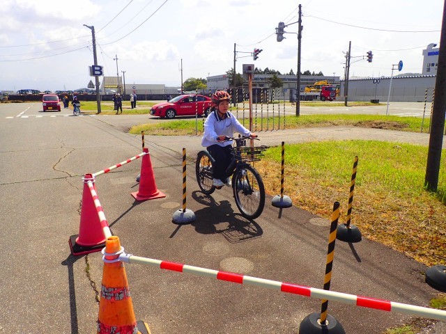 信号や狭い道、トラックの陰など、それぞれの場所で気を付けるべきポイントを聞きながら、自転車を走らせたり押したりして進みました。