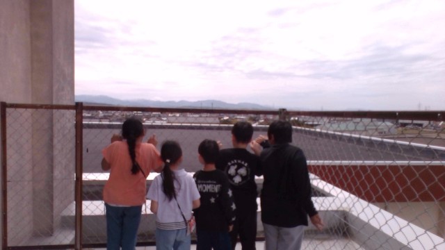 また、屋上に上がり、学校から東西南北の方角にどのような風景が見えるかを確かめ合いました。