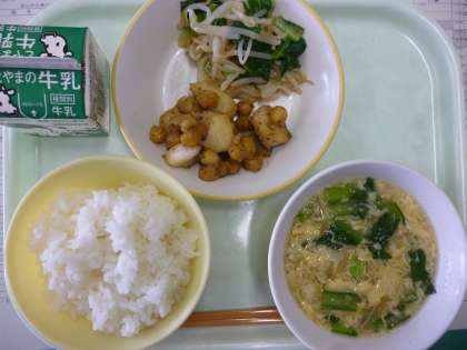 今日から、1年生も給食スタート!献立は、ごはん、牛乳、魚と豆のえごまみそからめ、おひたし、かきたま汁です。
