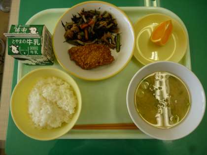 今日の給食は、ごはん、牛乳、魚の利久揚げ、ひじきの炒め煮、みそ汁、清見オレンジです。