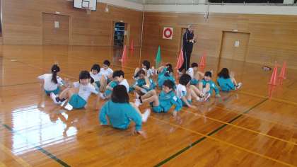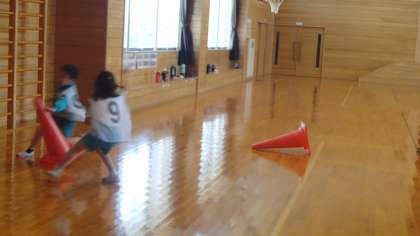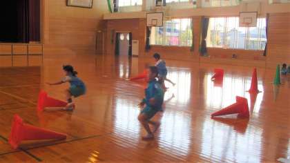 授業では鬼ごっこをしたり、チームに分かれて「コーンを倒す・元に戻す」ゲームをしたりしました。