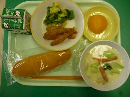 今日の給食は、米粉コッペパン、わかさぎのフリッター、グリーンサラダ、クリーム煮、ももかんです。寒い日にあたたまりました。