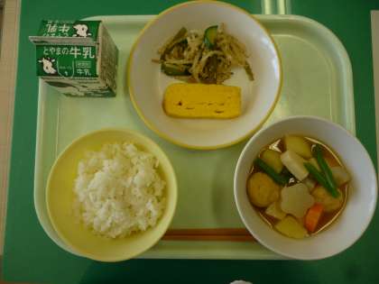 今日の給食は、ごはん、牛乳、関東だき、厚焼き卵、茎わかめのごま酢あえです。