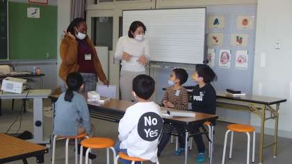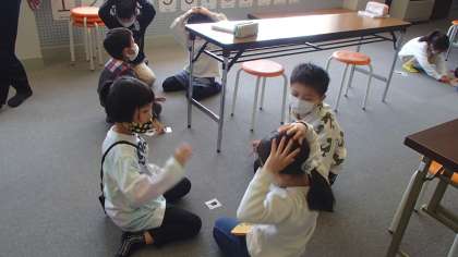 3限目には、小学校で初めての「外国語」の学習をしました。初めて会った人にする挨拶の仕方、色、ジャンケンを教えてもらい、楽しい時間になりました。