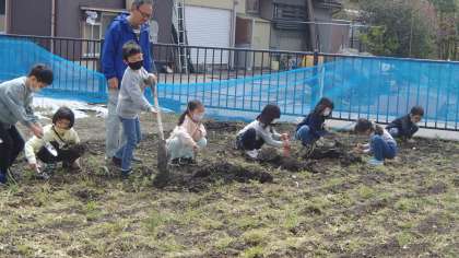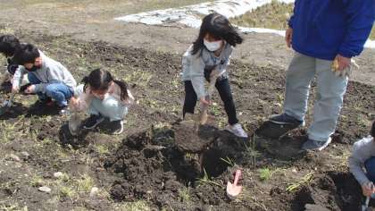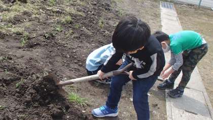 朝、子供たちが学校に来て、「畑が違う」とビックリしていました。そこで、いつも学校の子供たちのために協力をしてくださる地域の方がしてくれていることを伝え、子供たちも畑に出て、実際に耕す体験をしました。「おもしろかった」「楽しかったけど、畑をするのは大変だと思いました」「疲れました」等、いろいろと感じることができたようです。