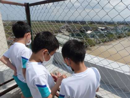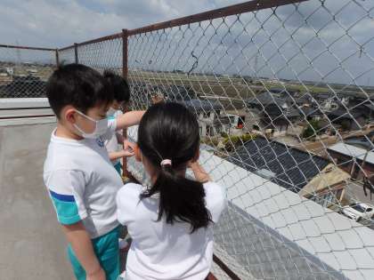 教室で方位磁針の使い方を練習した後は、実際に屋上に出て、東西南北を確かめました。