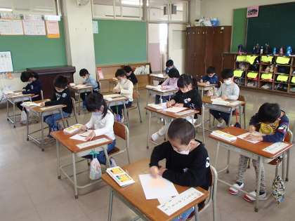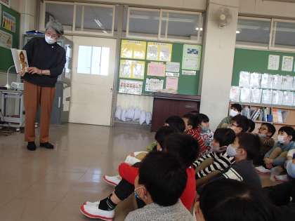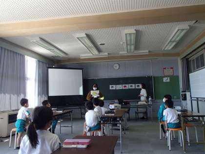 先週の木曜日の朝の時間に、地域の方に来ていただいて、読み聞かせをしていただきました。「やさいのせなか」や「やさいのおなか」など、クイズをしているみたいで、楽しく聞くことができました。また、ALTの先生と外国語の学習をしました。体を動かしたり、色を英語で言ったりしました。