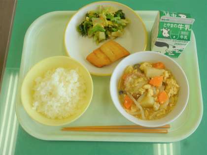 今日の給食は、ご飯、牛乳、揚げ魚のレモン味、いり大豆和え、油麩の卵とじです。