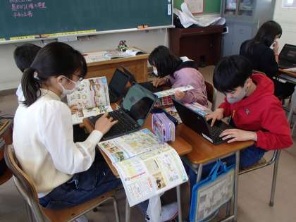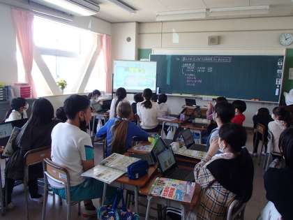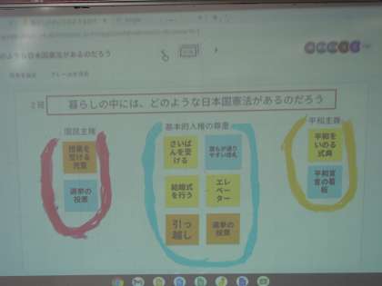 社会科「わたしたちのくらしと日本国憲法」では、暮らしの中にどのような日本国憲法があるのかを資料集を見ながらクロムブックを使って班ごとにまとめました。最初は、日本国憲法と関係のある暮らしについてジャムボードに書いていく班がほとんどだったのですが、だんだんと「三つの原則に分けてみようよ」と言って仲間分けをし始めました。「平和の式典て平和主義だよね」「投票って国民主権だよね」と友達と学び合っている様子が見られました。最後に、まとめの動画「NHK for school」を見ました。自分たちが話し合っていた内容と似ているものだったので「天気予報も日本国憲法に関係するの?」「本を読むのも?」などとつぶやきながら真剣に見ていました。自分たちが幸せに暮らせているのは、日本国憲法があるからなんだ、と振り返っている子供が多くいました。