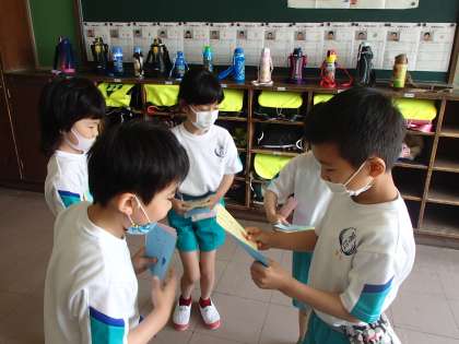 今日の国語の時間は、前回「どうぞ よろしく」の学習で作った自己紹介カードを、グループの友達と交換しました。名前と、すきなことなどを言って、「よろしくおねがいします」とカードを渡しました。