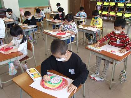 図工では、「自分だけのおひさまをかこう」の学習をしました。世界に一つのオリジナルなおひさまが出来上がりました!