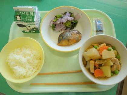 今日の給食は、ごはん、牛乳、鰆の西京焼き、ゆかり和え、大和煮、のり佃煮です。