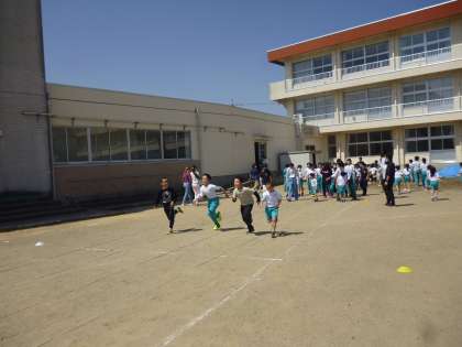 月・水・金のなかよしタイムは全校運動です。青空の下、元気に走っています。1年生と上学年が一緒に競走している姿もみかけました。
