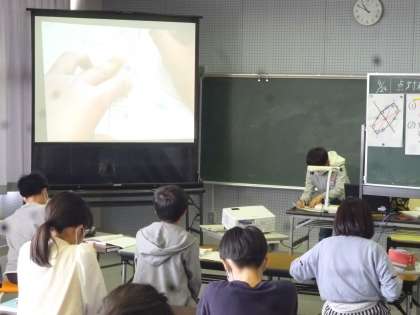 算数科「つりあいのとれた形を調べよう」の学習では、点対称の性質を使って、点対称な図形を書きました。点対称の性質はよく覚えており、「簡単。すぐに書けそう」と言っていた子供たちだったのですが、いざ書いてみると、「え?よく分からなくなってきた」「意外と難しい」と言いながら、友達と一生懸命考えていました。また、友達が書き方の説明をしている時は、プロジェクターを見つめながら真剣に聞いていました。そして、ペアで説明し合う時は、理解したことを友達に伝えようとしていました。「話す」「聞く」「考える」がしっかりできた一時間だったように思います。