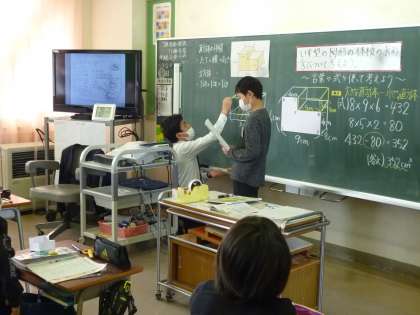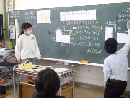 算数科「直方体と立方体のかさの表し方を考えよう」では、複雑な図形の体積の求め方について考えました。今日は、一人一人がいつも以上に真剣に学習に臨んでいたように感じました。ちょっと難しい学習内容でしたが、あきらめずにいろいろな方法を考えたり、自分には無かった考え方をしている友達の考えにじっと耳を傾けたりしている子供たちでした。これからもこの調子で、学習にぐっと集中して取り組んでほしいと思います。