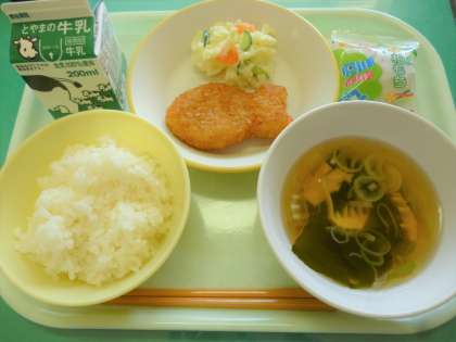 今日の給食は、ごはん、牛乳、おさかなカツ、ポテトサラダ、若竹汁、柏餅です。