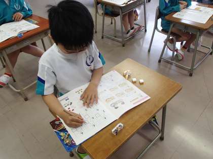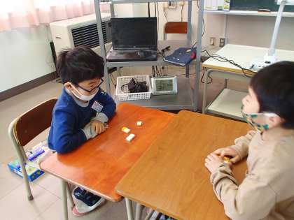 算数では「いくつと いくつ」を学習しています。昨日は、算数ブロックを使って、ペアの友達とクイズをしました。6このうち、いくつ手にかくれているかを当てました。今日は、ブロックを使いながら、教科書の問題に挑戦しました。