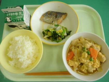 今日の給食は、ごはん、牛乳、親子煮、鰆の西京焼き、おひたしです。