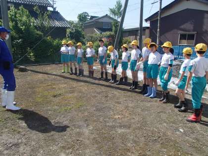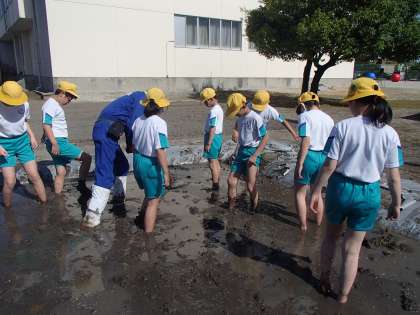 子供たちは、代掻きがどのような作業なのか、なかなかイメージをもてないまま、作業に取り組みましたが、お米を育てる上で大切な作業であることを地域の方に教えていただき、一生懸命足で土を踏みました。