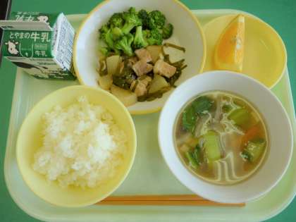 今日の給食は、ごはん、牛乳、豚肉と昆布の甘辛煮、ゆでブロッコリー、中華スープ、甘夏みかんです。豚肉と昆布の甘辛煮は、今月の新献立で、5月の給食だよりに紹介されています。