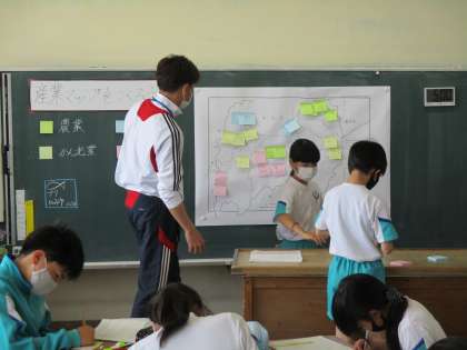 インターネットを使ったり、家族に聞いたりなどしてそれぞれがまとめてきたことを付箋に書き、大型白地図に貼り付けました。