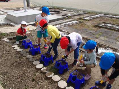 昨日の朝から、あさがおの水やりをはじめました。「早く、芽が出てね」と声をかけて水をやっています。
