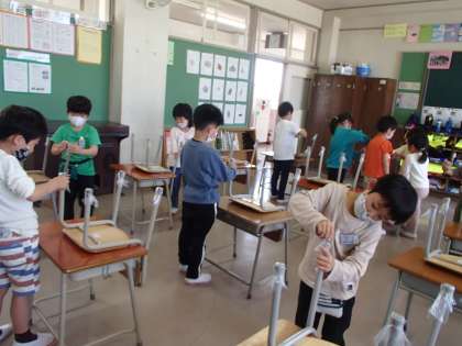 明日の運動会に向けて、自分のいすのあしにビニルをかぶせ、輪ゴムでとめました。ちょっと難しかったのですが、お友達と協力してがんばりました。明日は、たくさんの応援をお待ちしています!