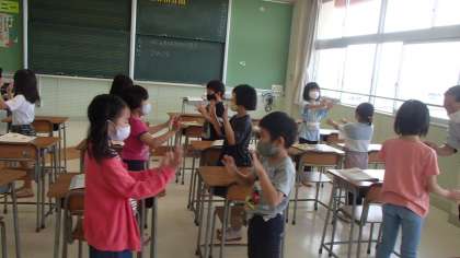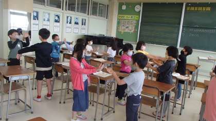 今日の音楽では、2拍子のリズム遊びをしました。それから、「はしの上で」という新しい曲を聴き、歌ったり、リズムに合わせて手拍子をしたりしました。最後に、曲に合わせて友達とエアタッチでして楽しみました。