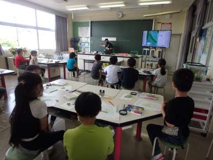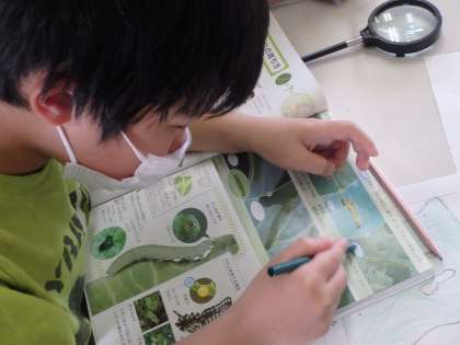 教室にいるチョウの幼虫たちに愛着がわいてきたようで、休み時間などに積極的に虫かごをのぞいている子供たちです。